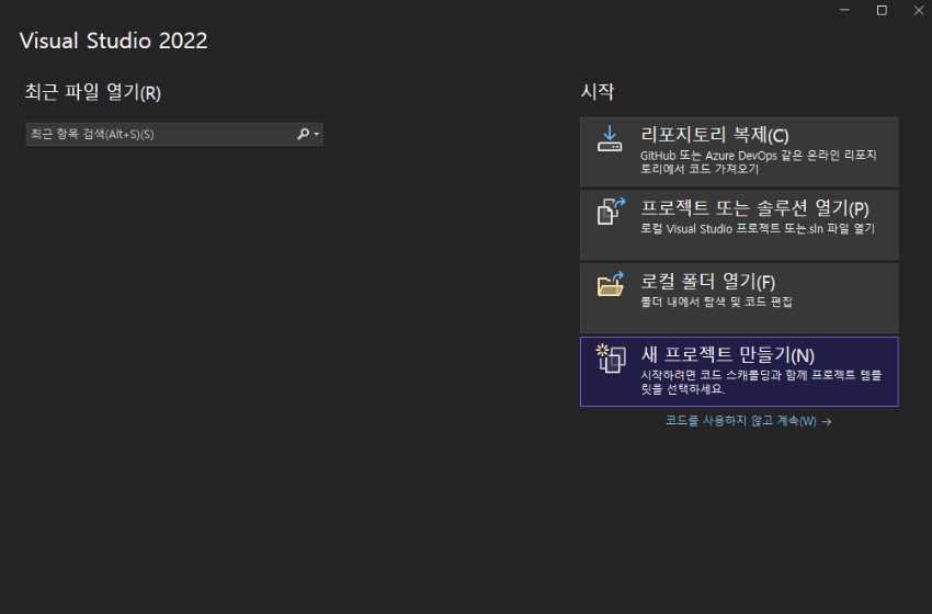 Visual Studio 2022 를 실행해서 새 프로젝트 만들기를 클릭합니다.